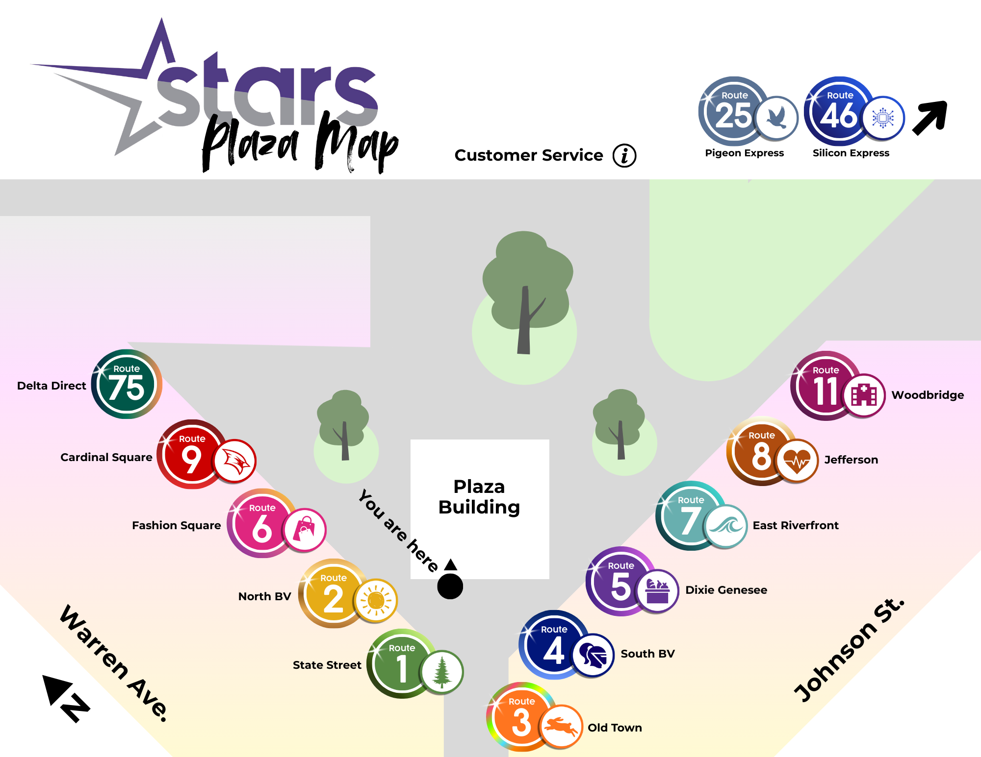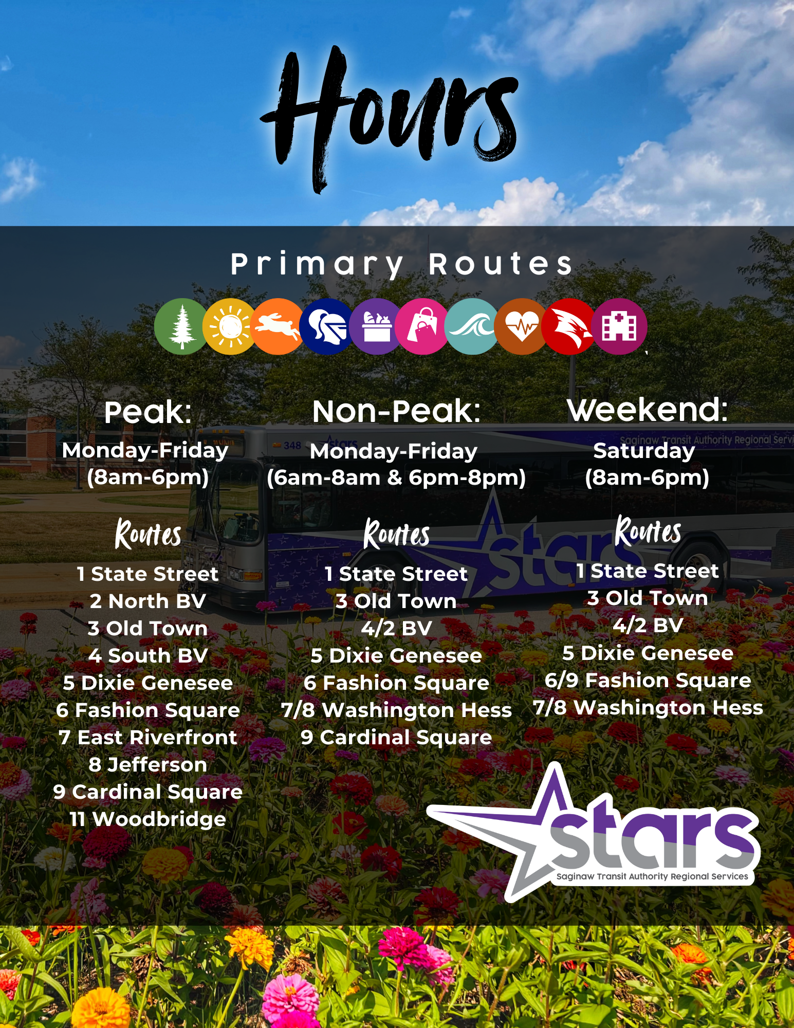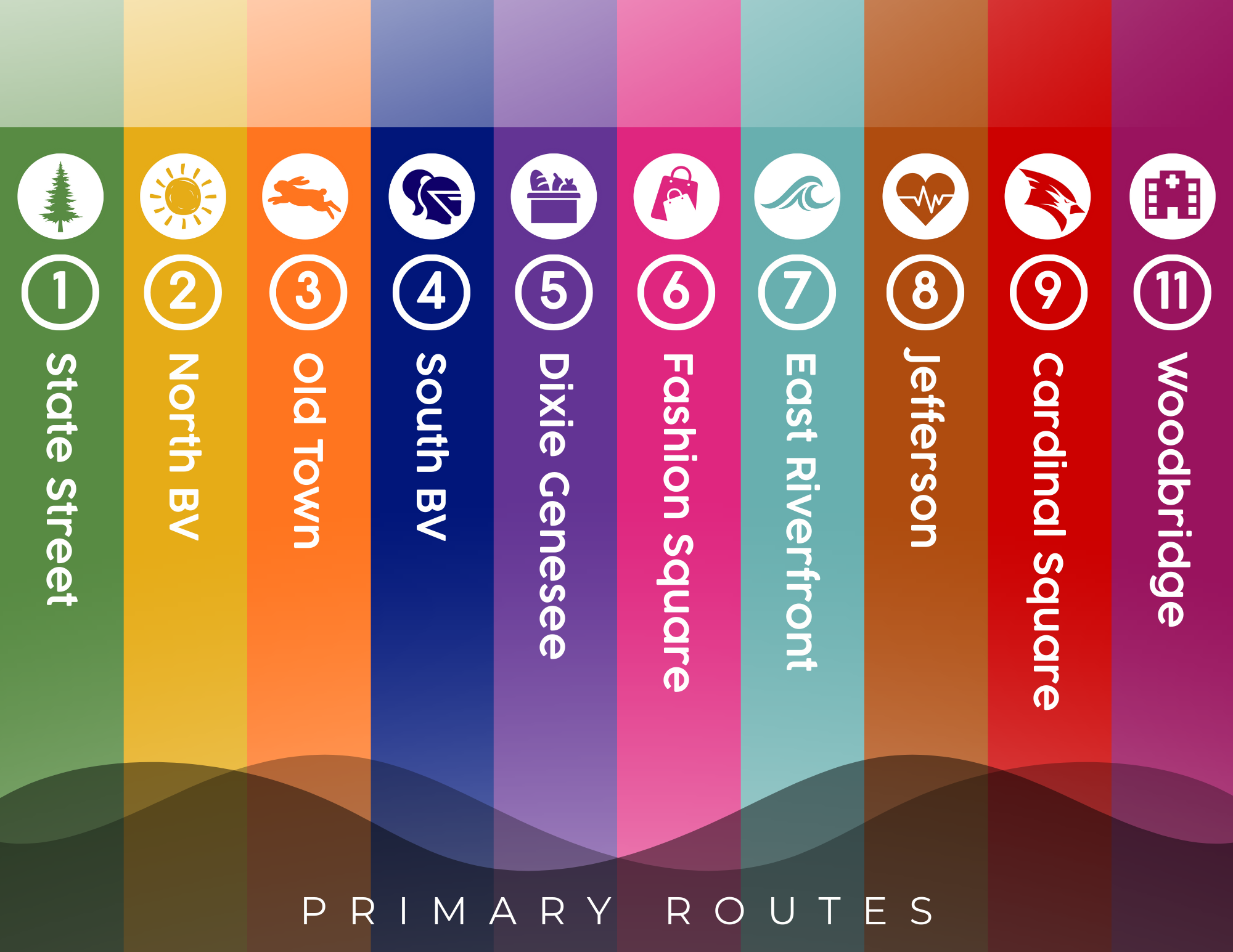 Primary Routes 1 State Street 2 North BV 3 Old Town 4 South BV 5 Dixie Genesee 6 Fashion Square 7 East Riverfront 8 Jefferson 9 Cardinal Square 11 Woodbridge Non-Peak Route Design
