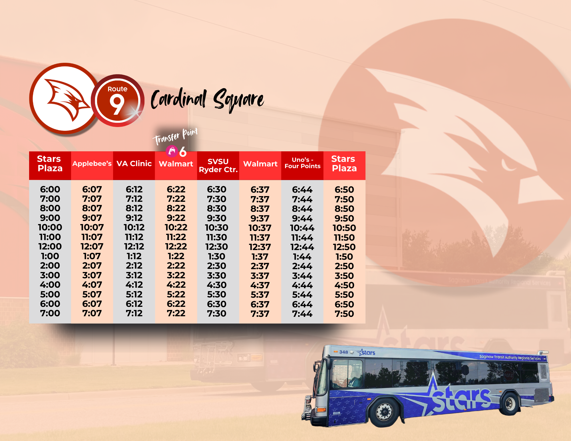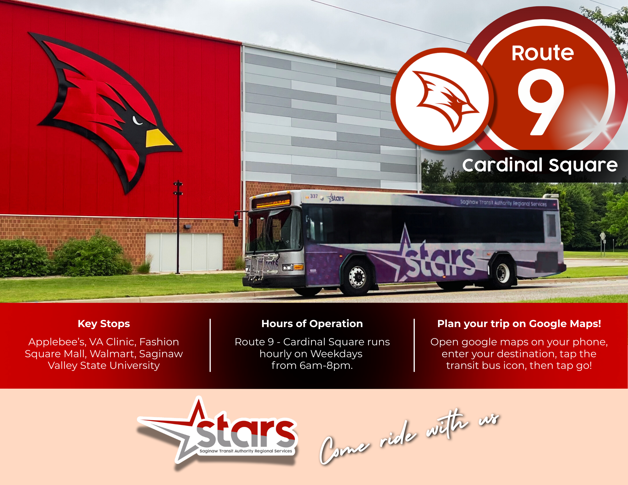 Primary Routes 1 State Street 2 North BV 3 Old Town 4 South BV 5 Dixie Genesee 6 Fashion Square 7 East Riverfront 8 Jefferson 9 Cardinal Square 11 Woodbridge Non-Peak Route Design Route 9 Cardinal Square Interactive Map - 9 Cardinal SquareBrochure – 9 Cardinal Square Route 9 Trifold