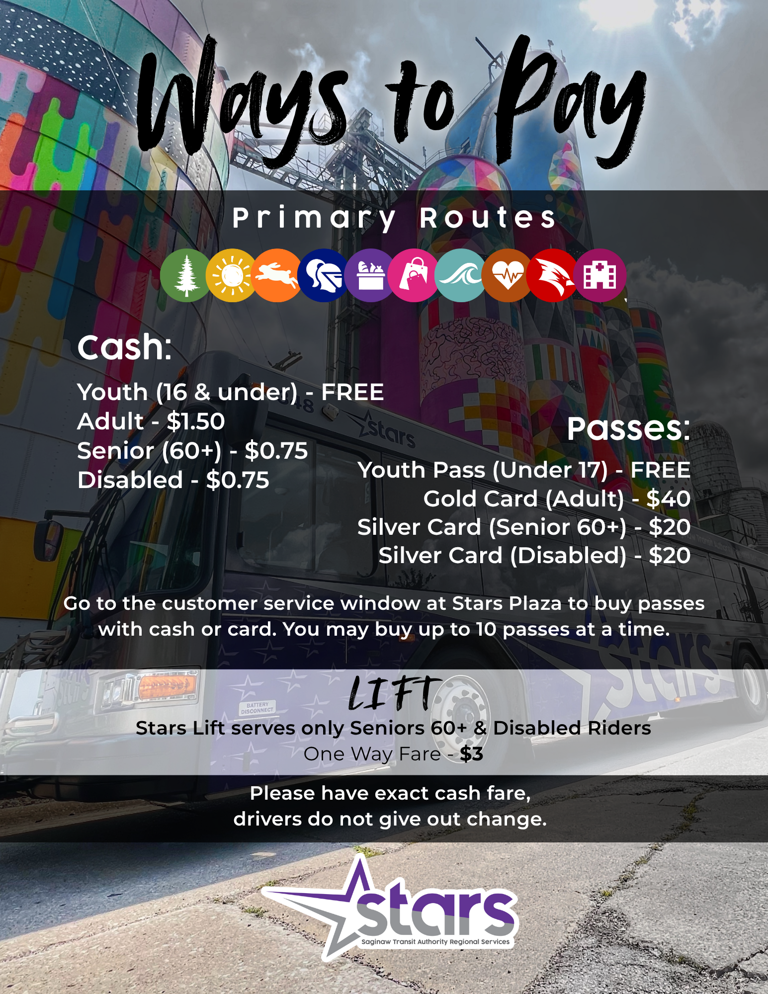 STARS operates a network of fixed-route buses that travel on scheduled loops throughout Saginaw and surrounding areas. Buses generally depart from the central plaza every 60 minutes, with service Monday–Friday 6AM-8PM and on Saturdays 8AM-6PM. Each route follows the same set path and stops at marked bus stop signs where passengers can board or get off. This service is ideal for daily trips to work, school, shopping, and other local destinations. Riders pay a fare when boarding (exact change required) or can purchase 30-day passes for unlimited rides. Rides can be planned with the transit option of Google Maps, and STARS also offers route planning help through Customer Service if needed.