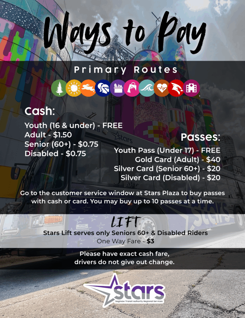 STARS Lift is a complementary paratransit service offered by the Saginaw Transit Authority Regional Services in accordance with the 1990 Americans with Disabilities Act (ADA). STARS Lift provides transportation for persons with disabilities, who cannot board, ride or disembark from a STARS fixed-route bus, even if that bus is equipped with a wheelchair lift or ramp.